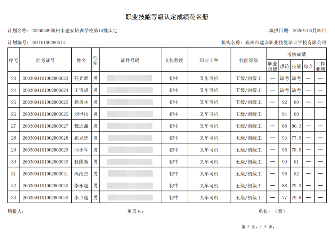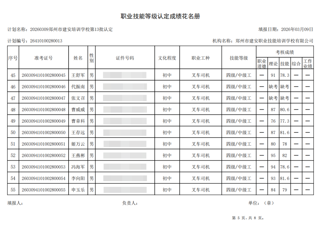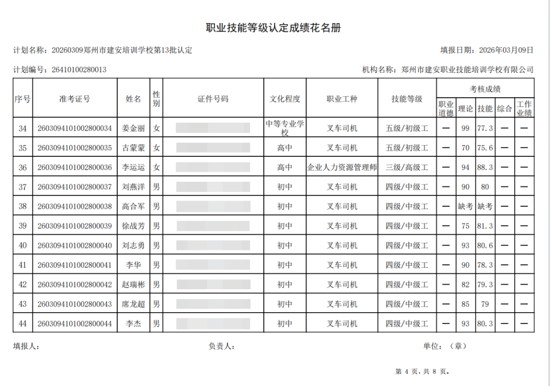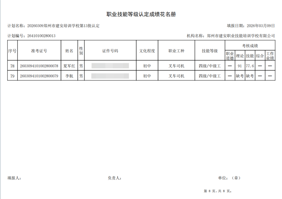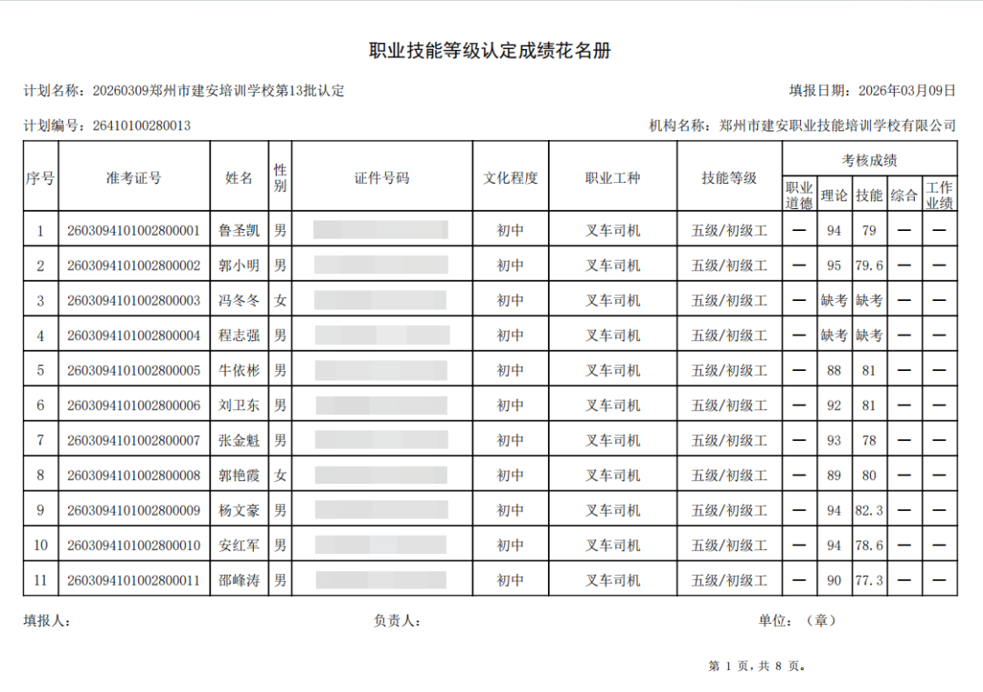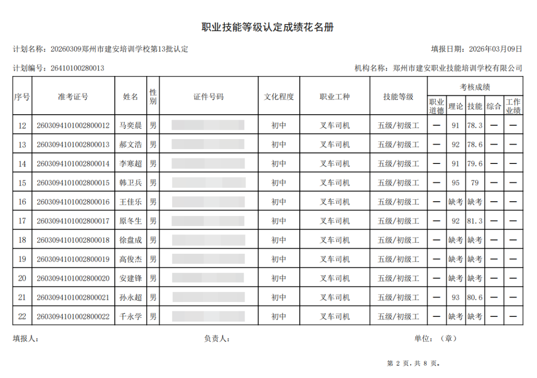 2026年3月9日,在郑州市建安职业技能培训学校进行的第13批【叉车司机】职业技能等级认定考试,阅卷工作已结束,现将各位考生成绩予以公示,公示期为5天,公示期限为:2026年3月10日至2026年3月14日。