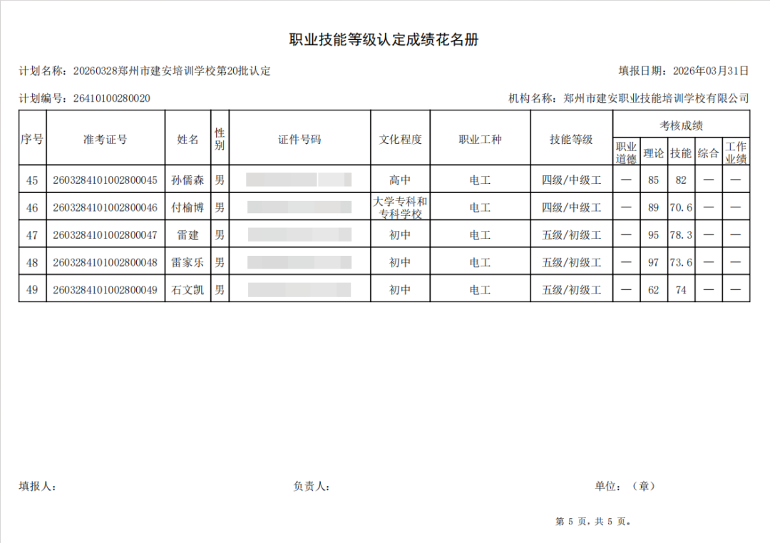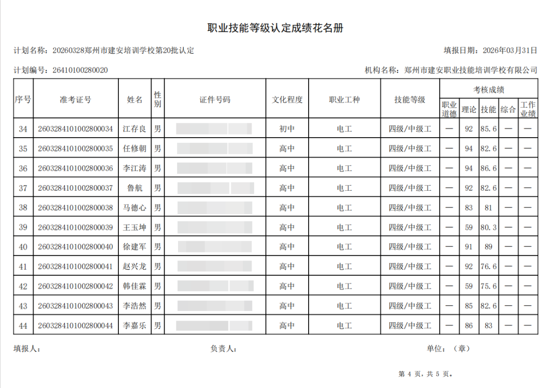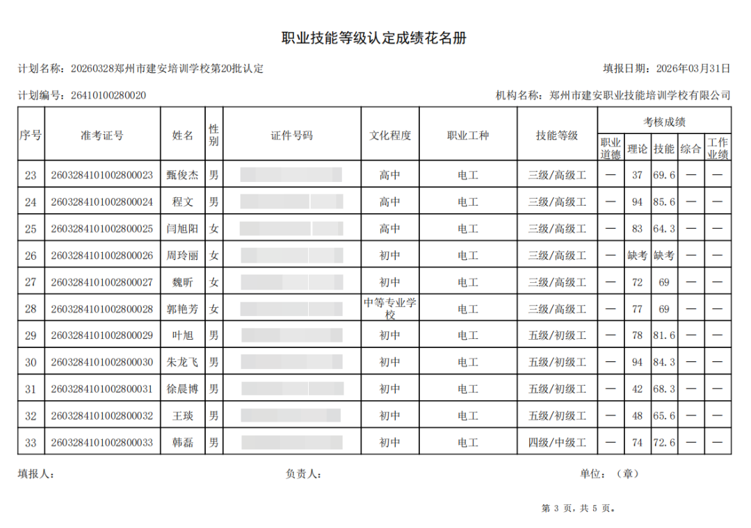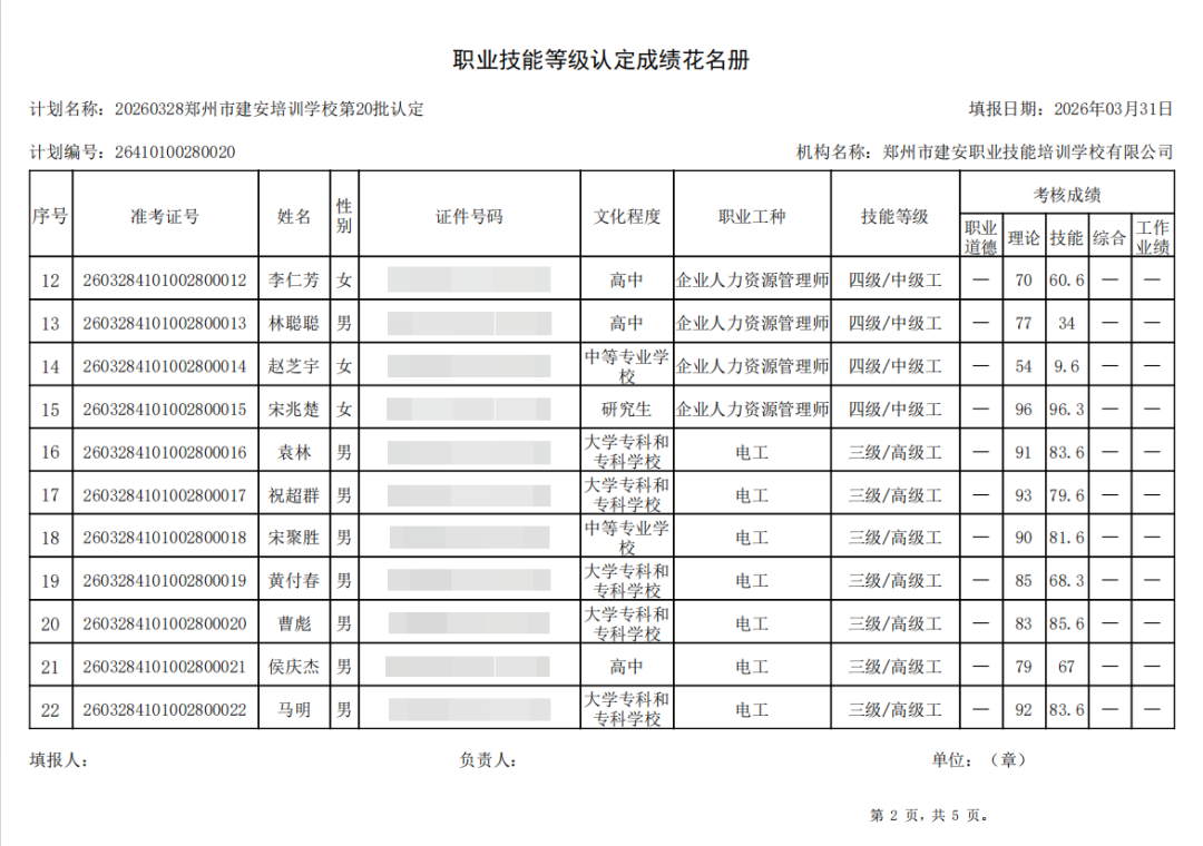 2026年3月28日,在郑州市建安职业技能培训学校进行的第20批【企业人力资源管理师】【电工】职业技能等级认定考试,阅卷工作已结束,现将各位考生成绩予以公示,公示期为5天,公示期限为:2026年3月31日至2026年4月4日。