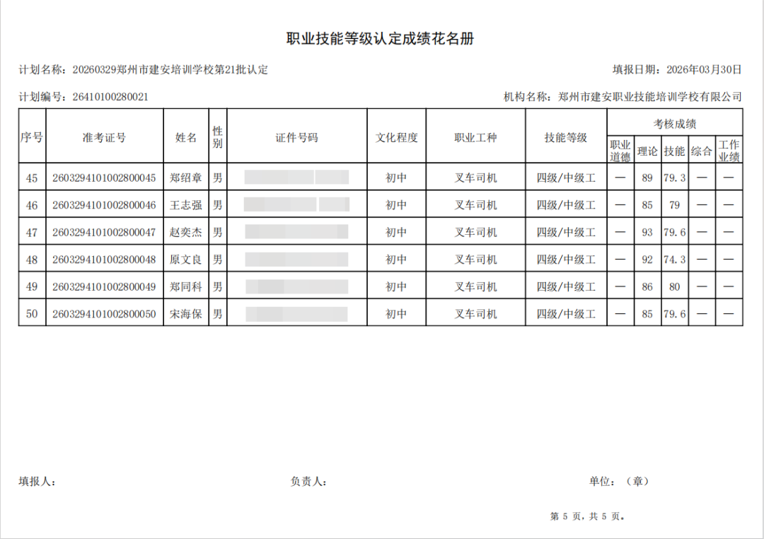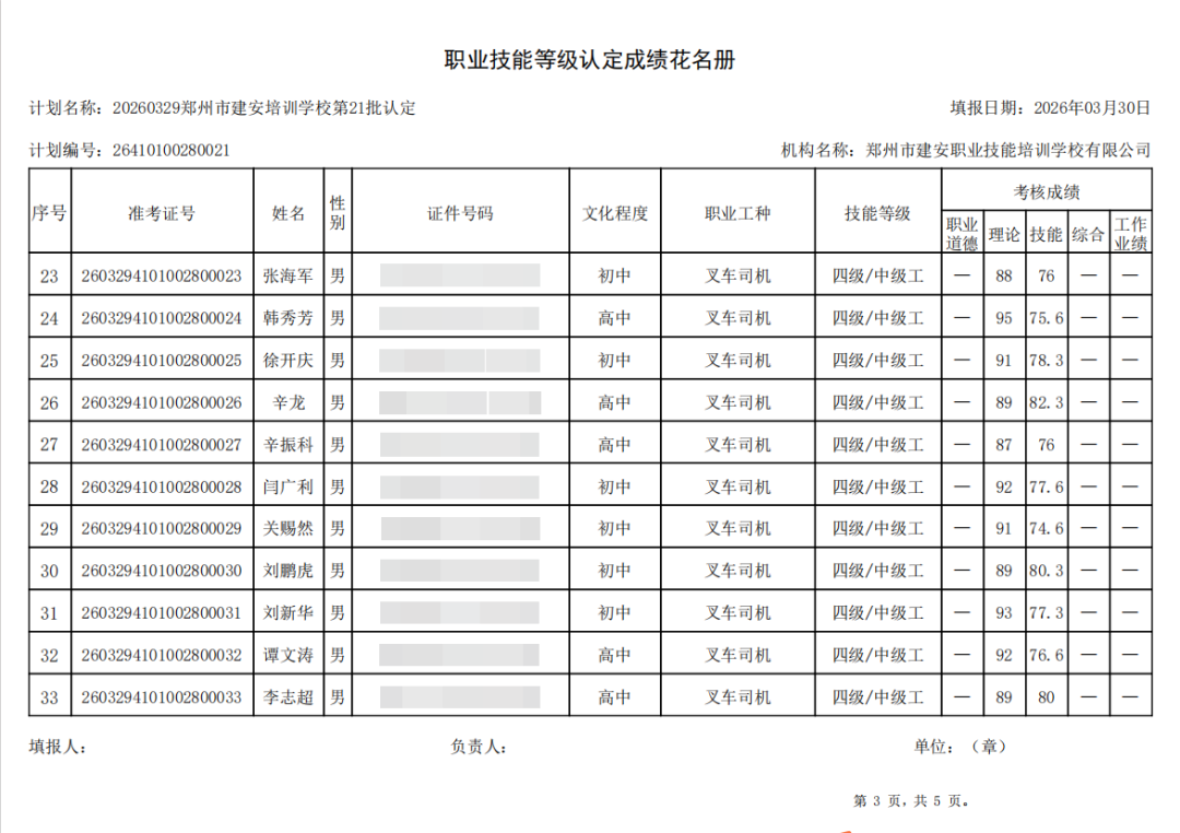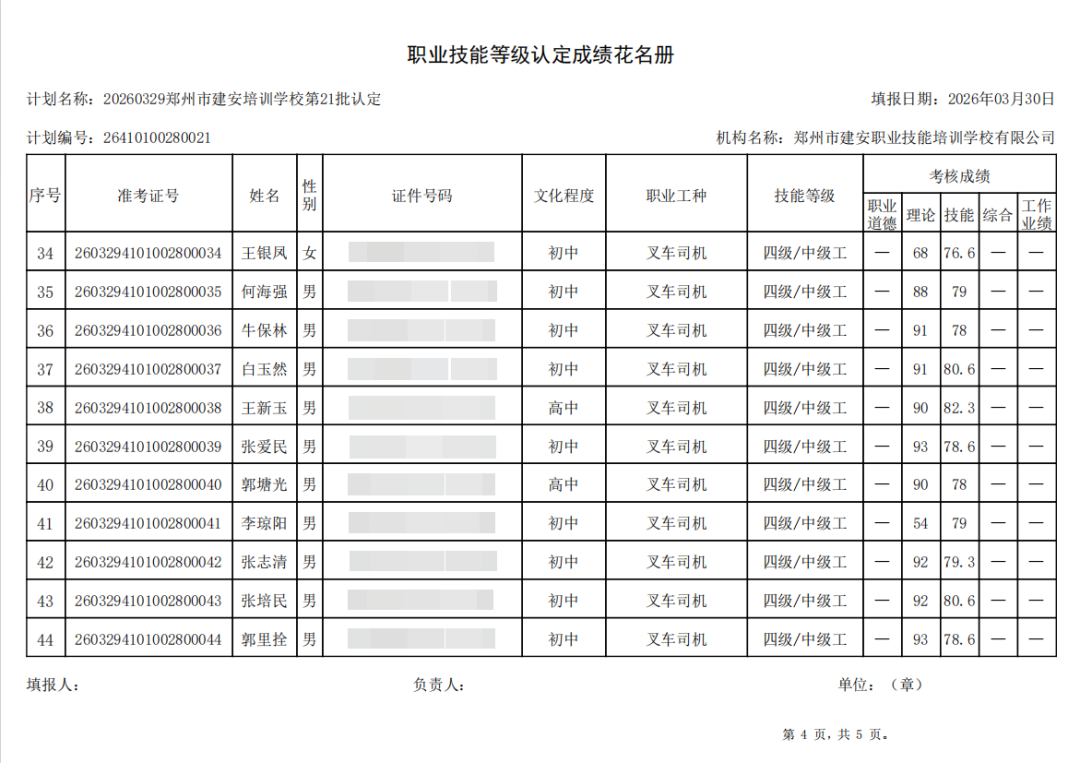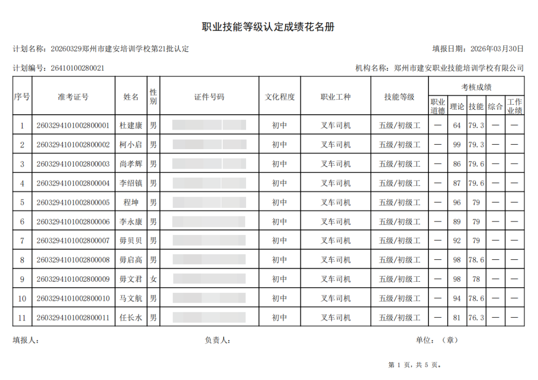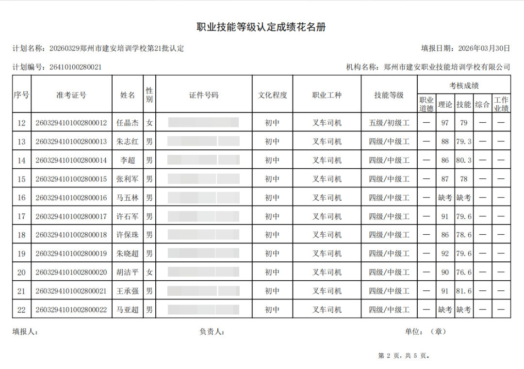 2026年3月29日,在郑州市建安职业技能培训学校进行的第21批【叉车司机】职业技能等级认定考试,阅卷工作已结束,现将各位考生成绩予以公示,公示期为5天,公示期限为:2026年3月31日至2026年4月4日。