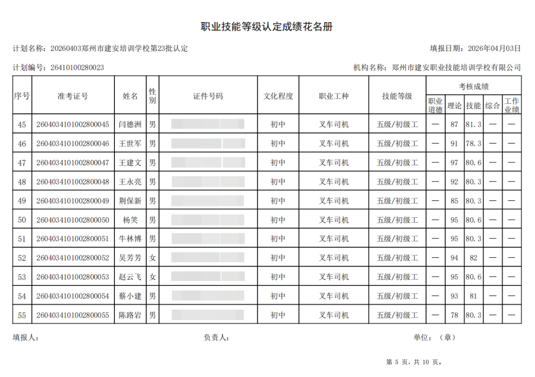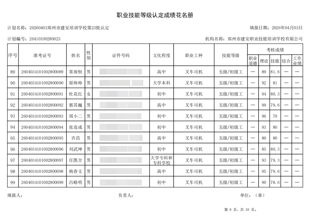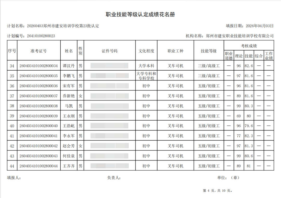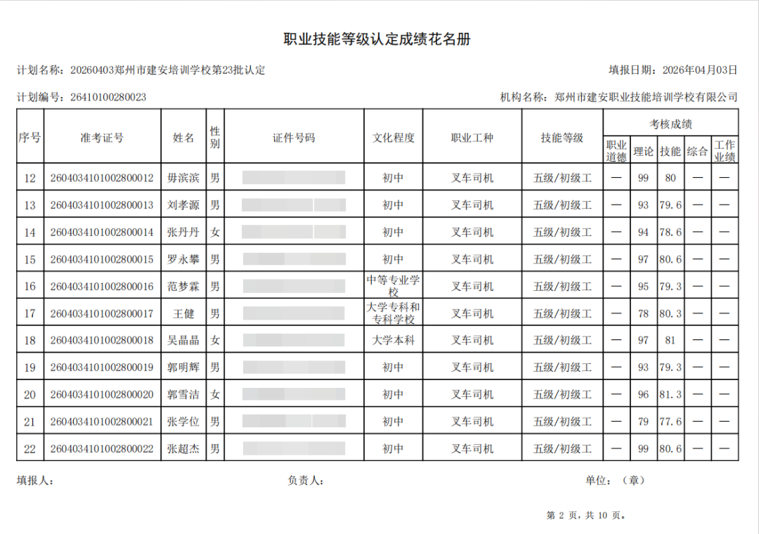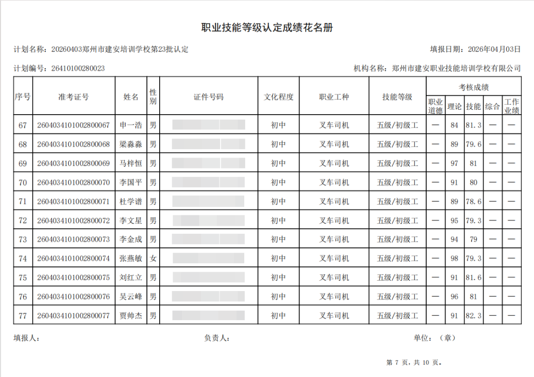 2026年4月3日,在郑州市建安职业技能培训学校进行的第23批【叉车司机】职业技能等级认定考试,阅卷工作已结束,现将各位考生成绩予以公示,公示期为5天,公示期限为:2026年4月13日至2026年4月17日。
