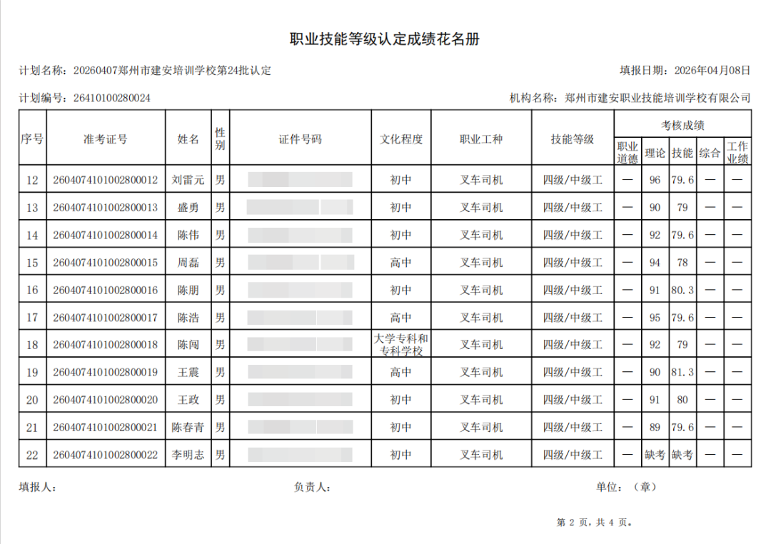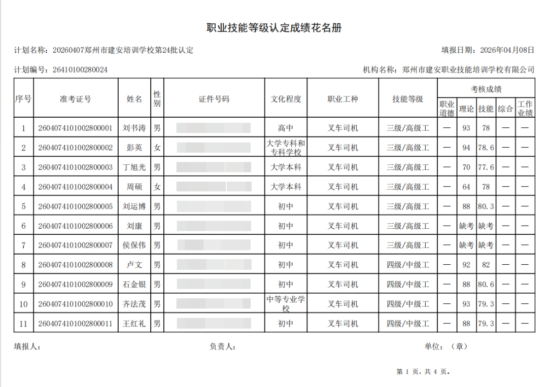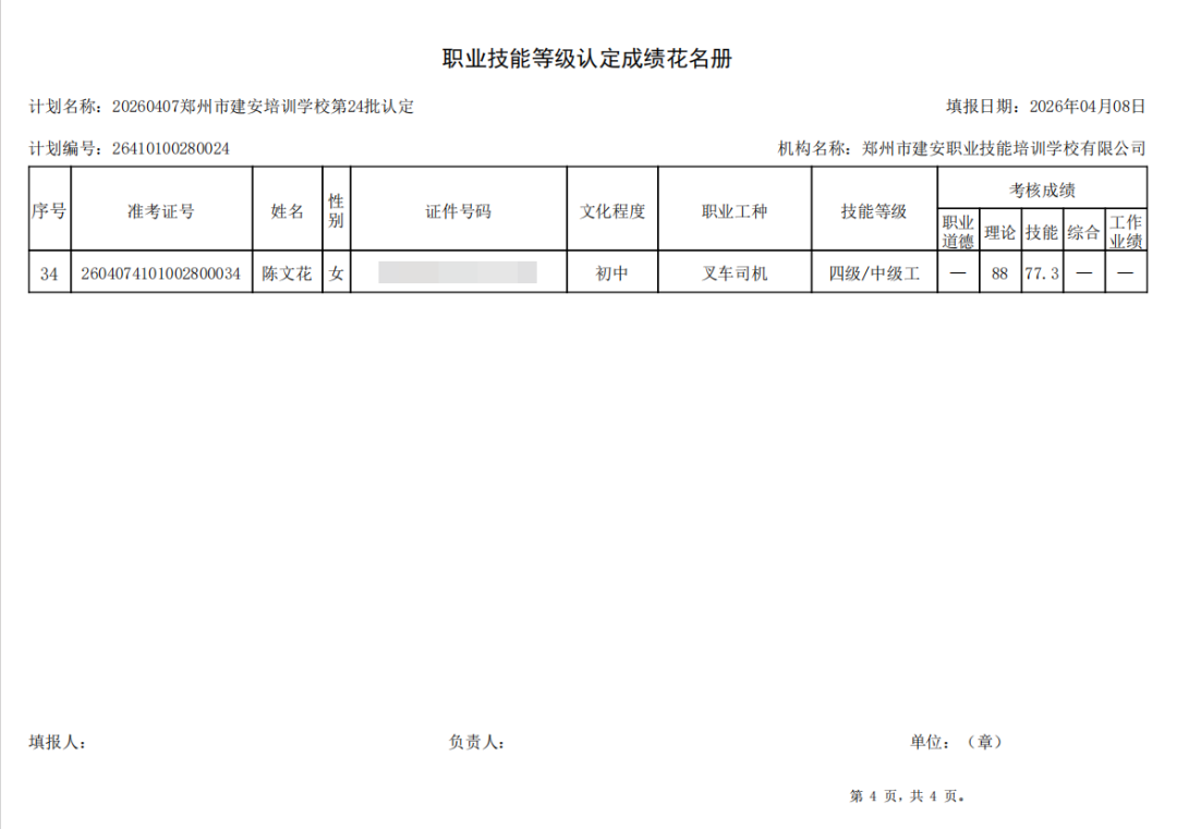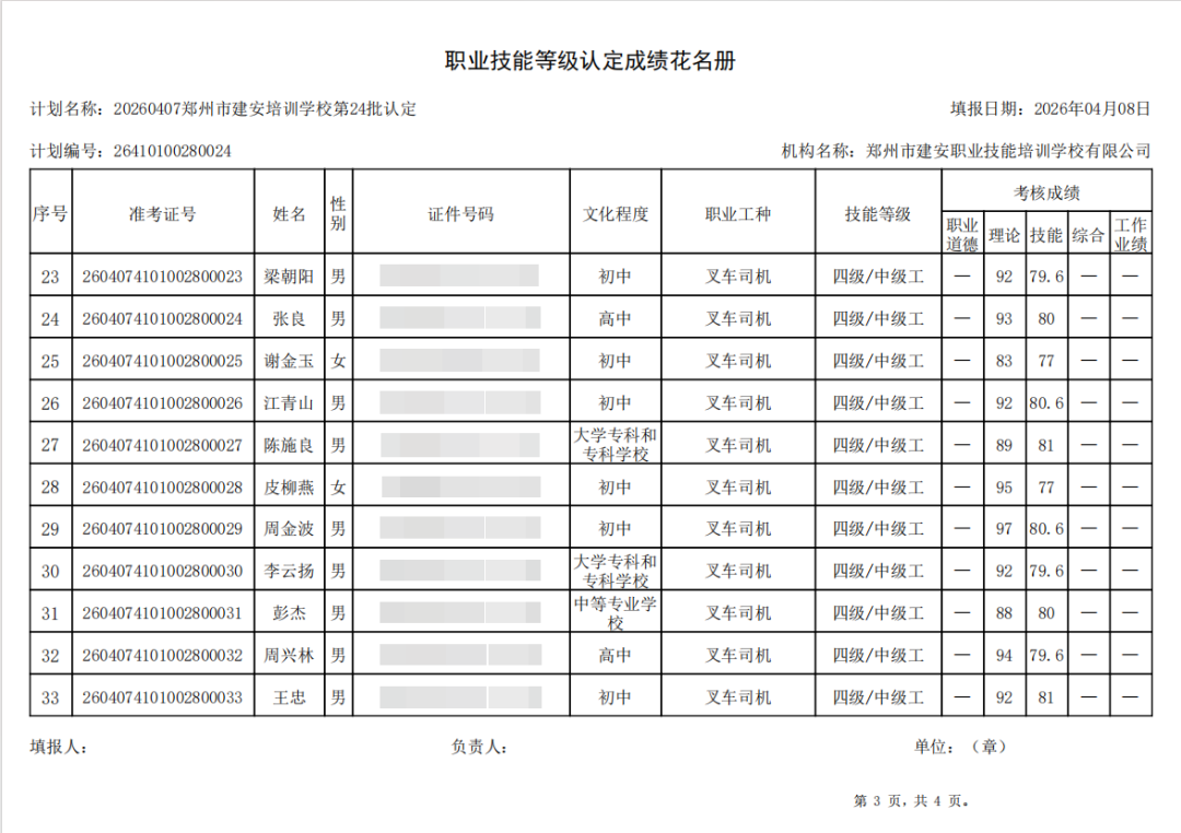 2026年4月7日,在郑州市建安职业技能培训学校进行的第24批【叉车司机】职业技能等级认定考试,阅卷工作已结束,现将各位考生成绩予以公示,公示期为5天,公示期限为:2026年4月13日至2026年4月17日。