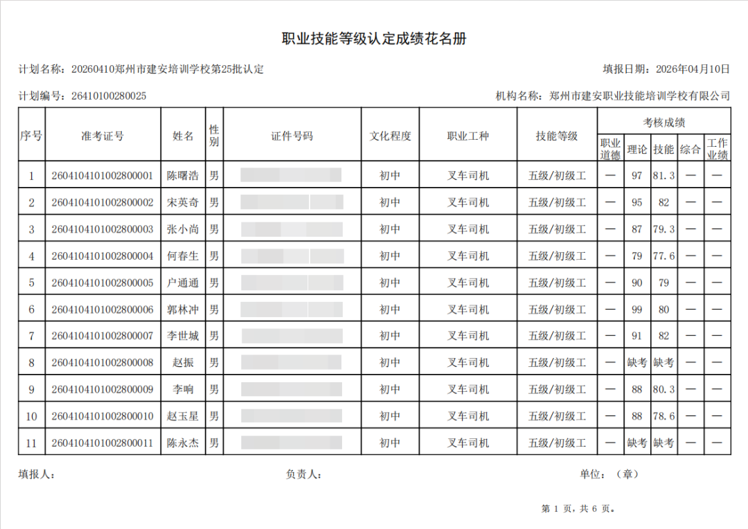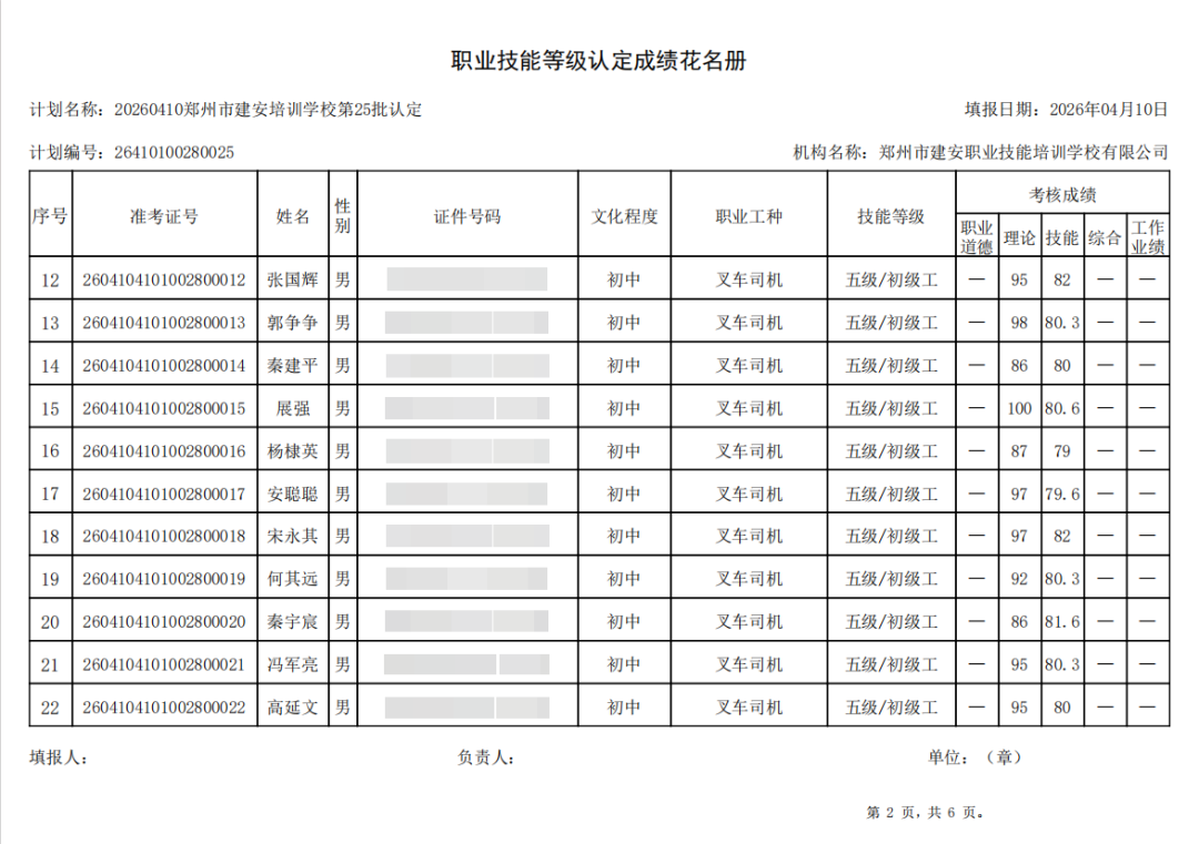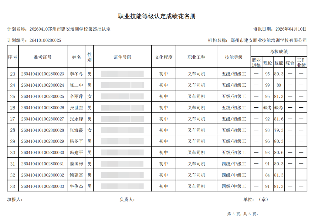 2026年4月10日,在郑州市建安职业技能培训学校进行的第25批【叉车司机】【电工】职业技能等级认定考试,阅卷工作已结束,现将各位考生成绩予以公示,公示期为5天,公示期限为:2026年4月13日至2026年4月17日。