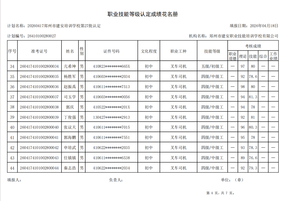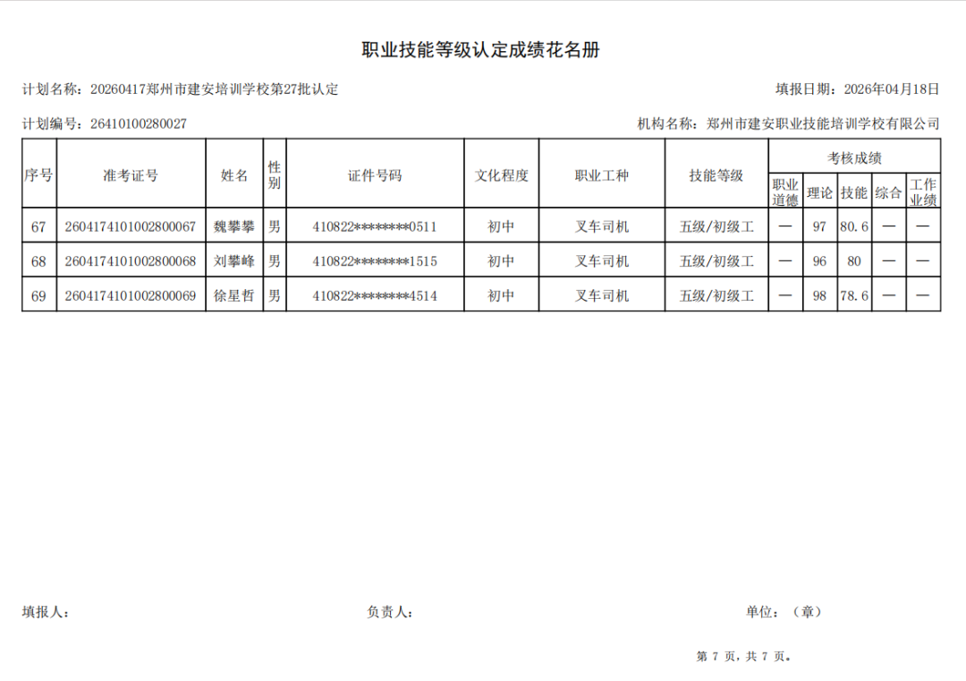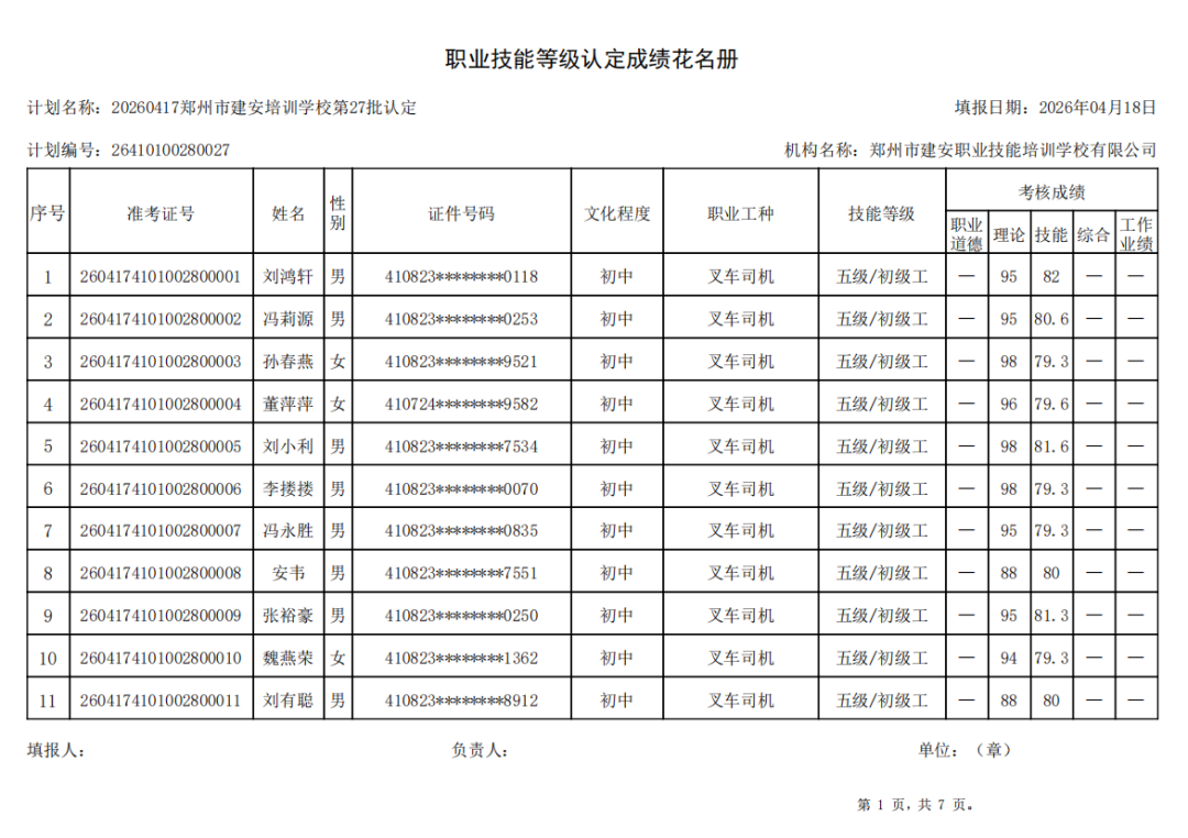 2026年4月17日,在郑州市建安职业技能培训学校进行的第27批【叉车司机】职业技能等级认定考试,阅卷工作已结束,现将各位考生成绩予以公示,公示期为5天,公示期限为:2026年4月20日至2026年4月24日。