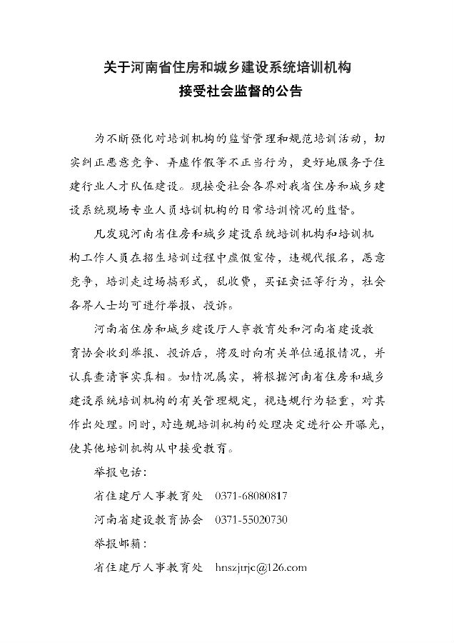关于河南省住房和城乡建设系统培训机构接受社会监督的公告