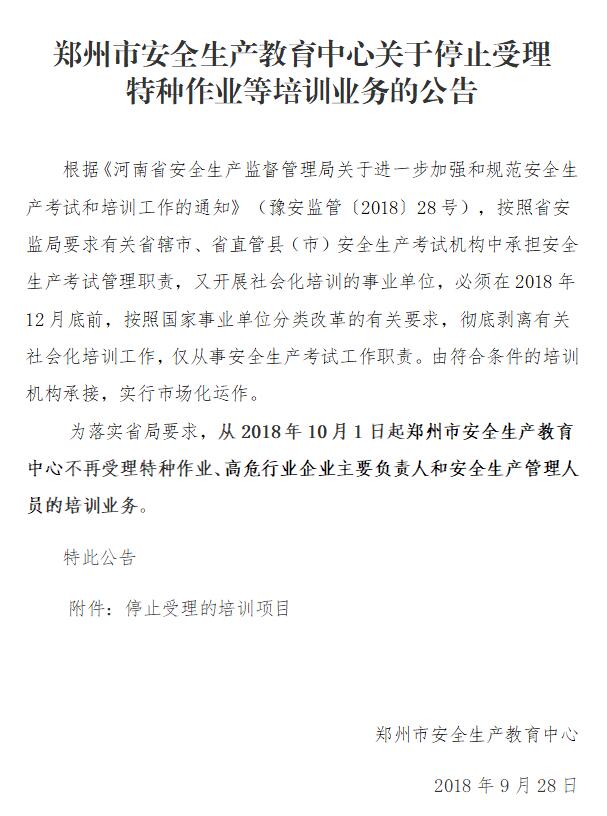 郑州市安全生产教育中心关于停止受理特种作业等培训业务的公告