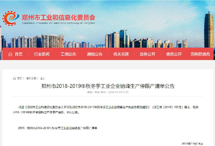 通气会上郑州市工信委相关负责人发布全市钢铁、焦化、铸造、建材有色金属、医药(农药)等行业实施错峰生产,具体实施时间为2018年11月15日至2019年3月15日,郑州599家企业将会限产或者停产,同时,从事这些行业的朋友将会受到波及。