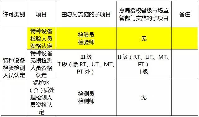 为深入贯彻落实《中共中央 国务院关于推进安全生产领域改革发展的意见》及国务院在全国推行“证照分离”改革的要求,推进《特种设备安全监管改革顶层设计方案》实施,有效降低企业制度性交易成本,加强特种设备监管,经广泛征求意见,市场监管总局对现行特种设备生产许可项目、特种设备作业人员和检验检测人员资格认定项目进行了精简整合,制定了《特种设备生产单位许可目录》(附件1)、《特种设备作业人员资格认定分类与项目》(附件2)、《特种设备检验检测人员资格认定项目》(附件3),现予公告。