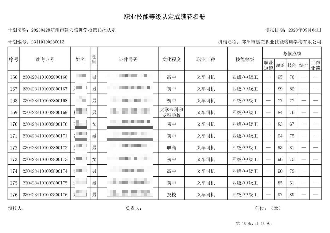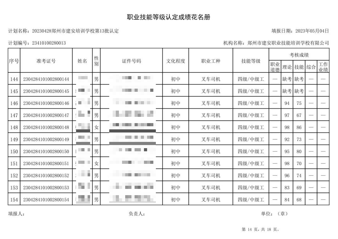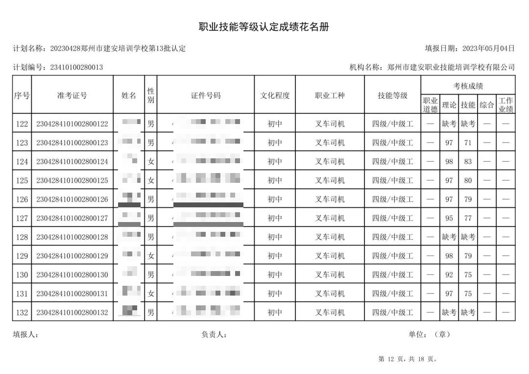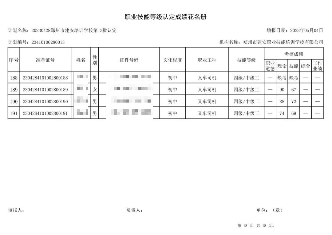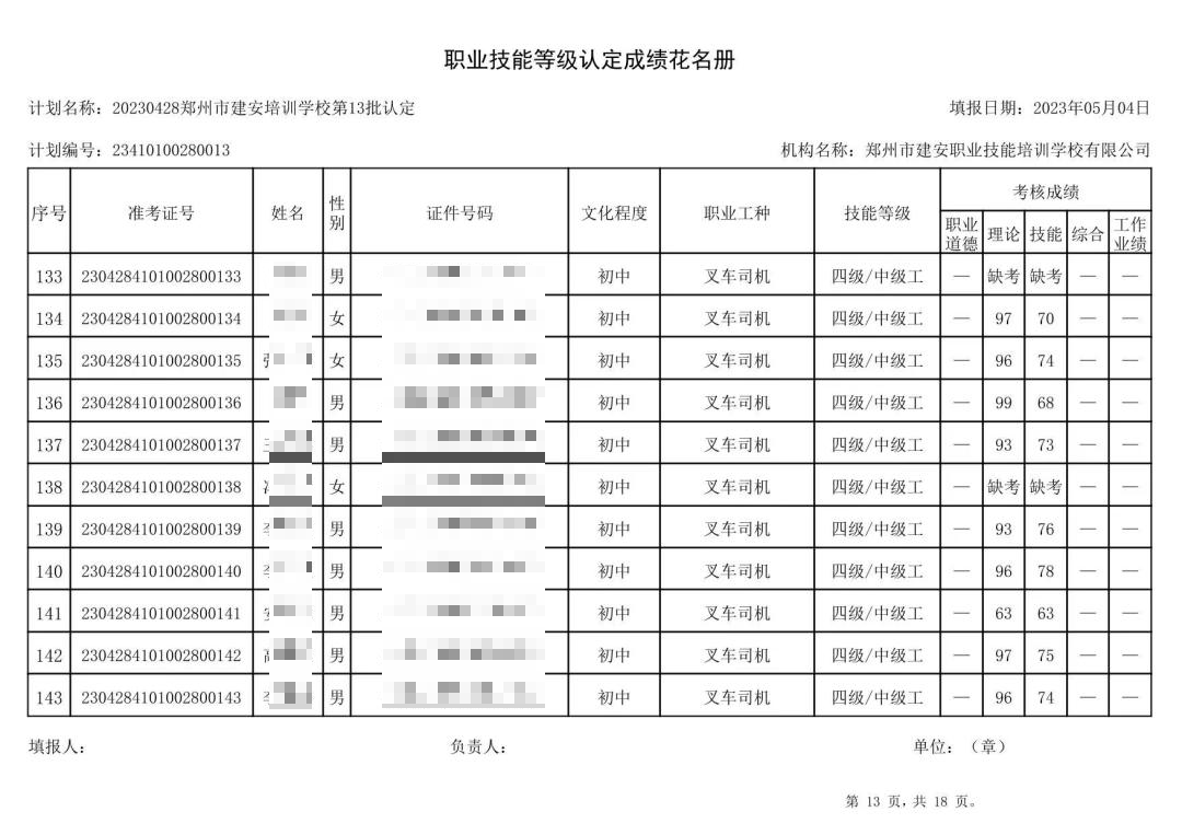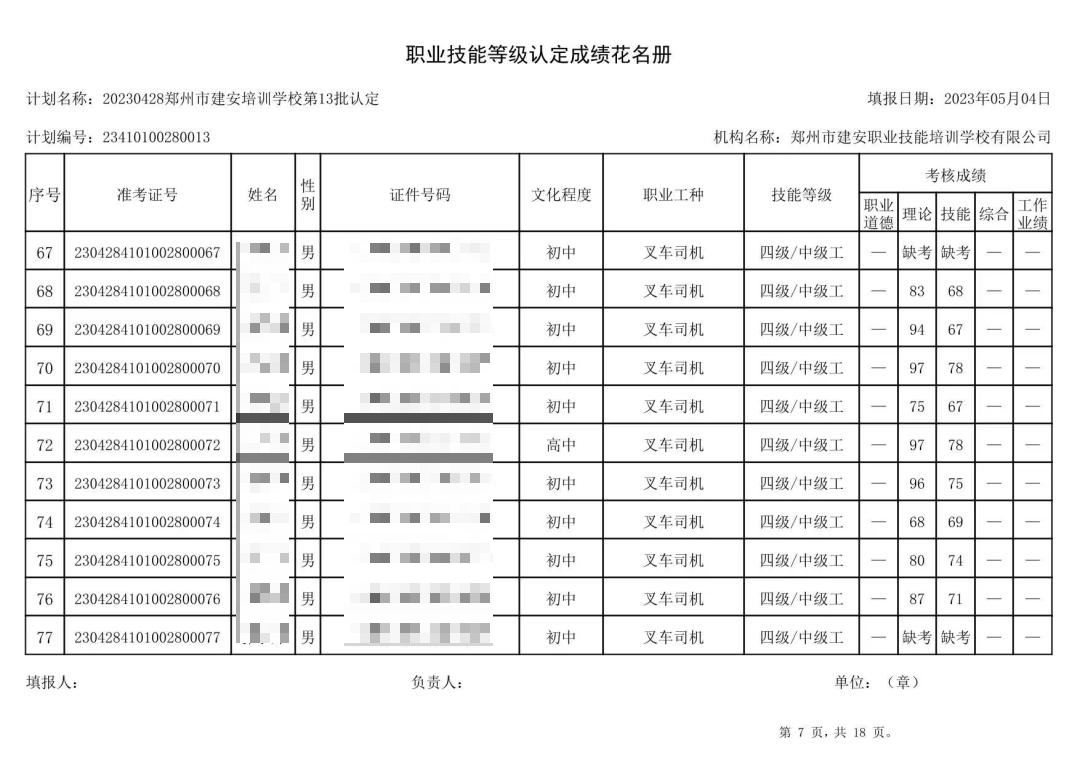 2023年4月28日,在郑州市建安技能培训学校进行的第13批次【叉车司机】职业技能等级认定考试,阅卷工作已结束,现将各位考生成绩予以公示,公示期为3天,公示期限为:2023年5月4日至2023年5月7日。