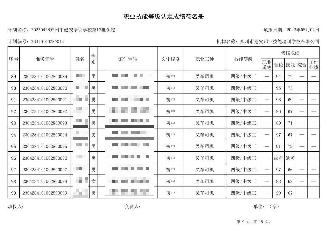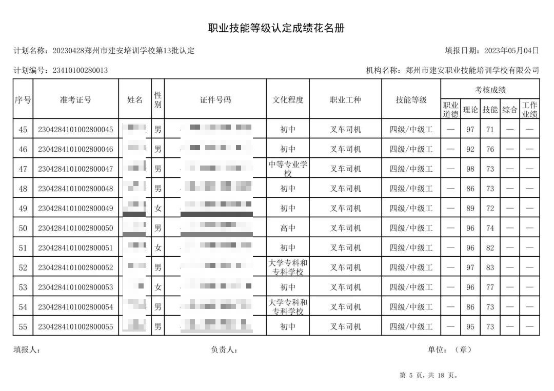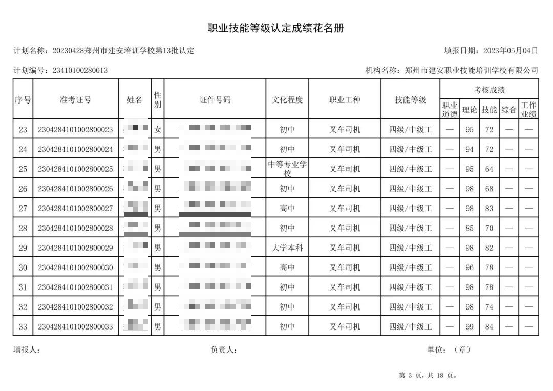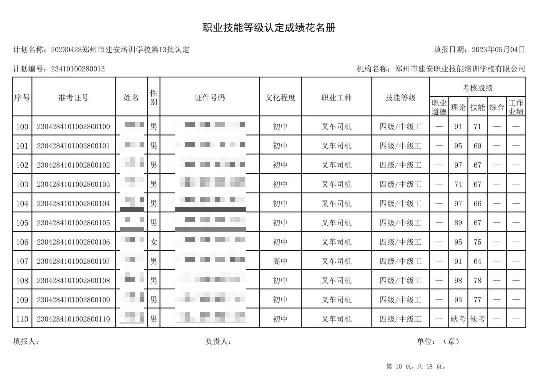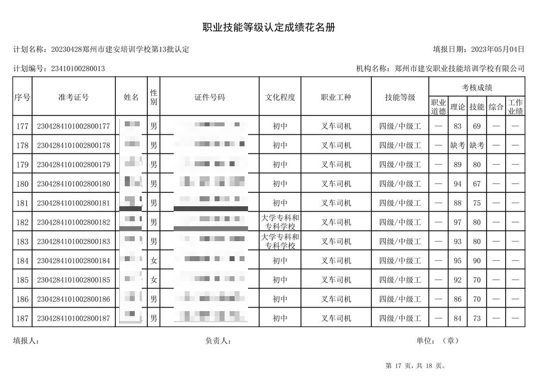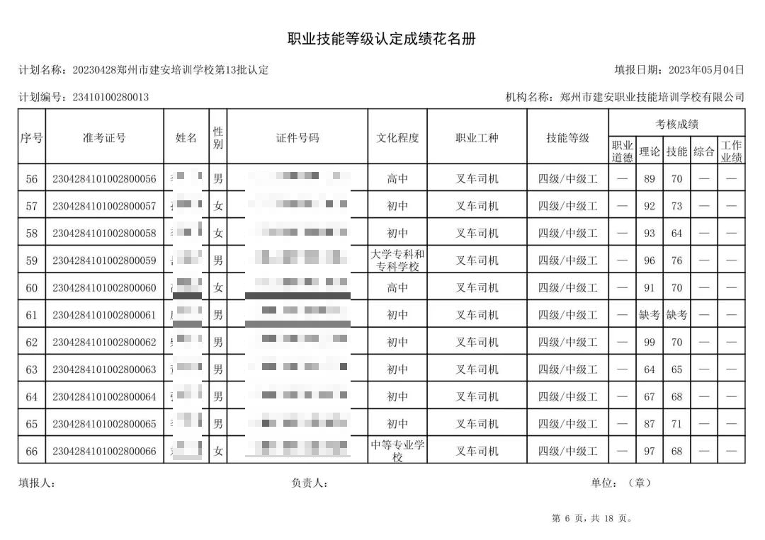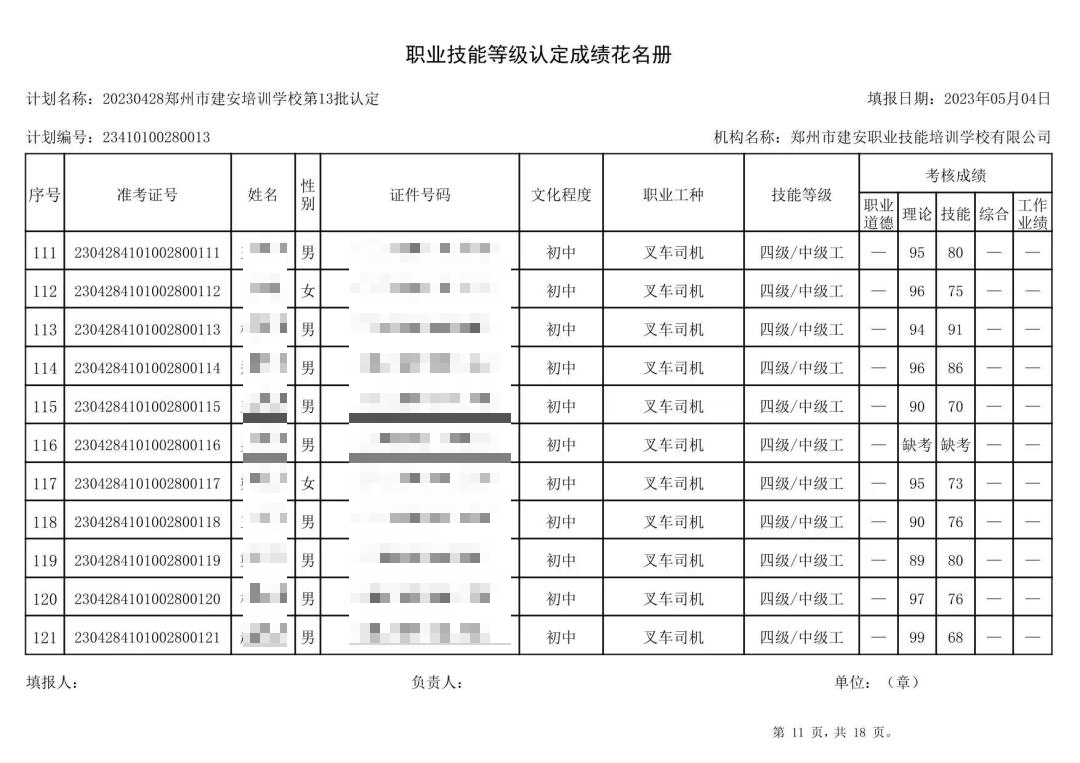 2023年4月28日,在郑州市建安技能培训学校进行的第13批次【叉车司机】职业技能等级认定考试,阅卷工作已结束,现将各位考生成绩予以公示,公示期为3天,公示期限为:2023年5月4日至2023年5月7日。
