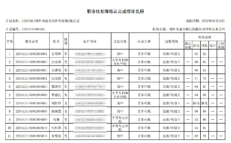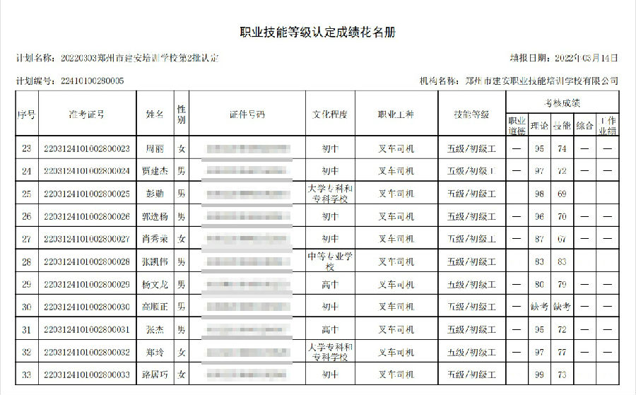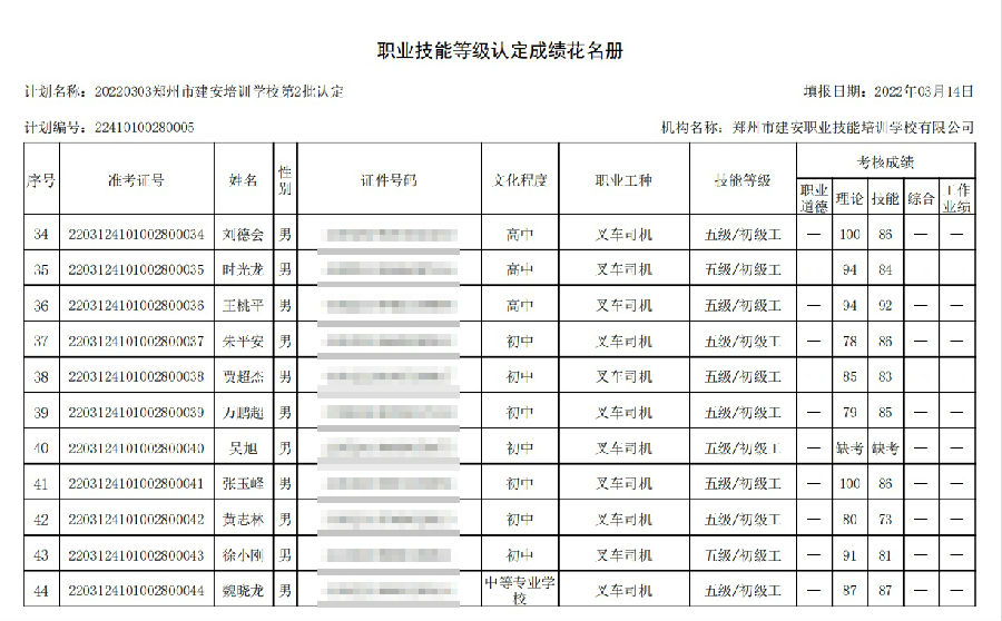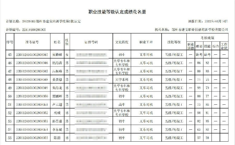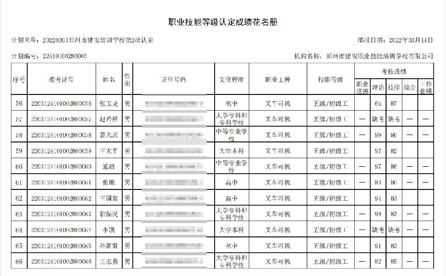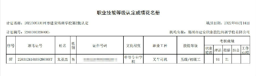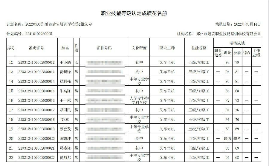 2022年03月12日在郑州建安技能培训学校进行的【叉车司机 五级/初级工】职业技能等级认定考试,阅卷工作已结束,现将各位考生成绩予以公示,公示期为7天,公示期限为:2022年03月14日至2022年03月21日。