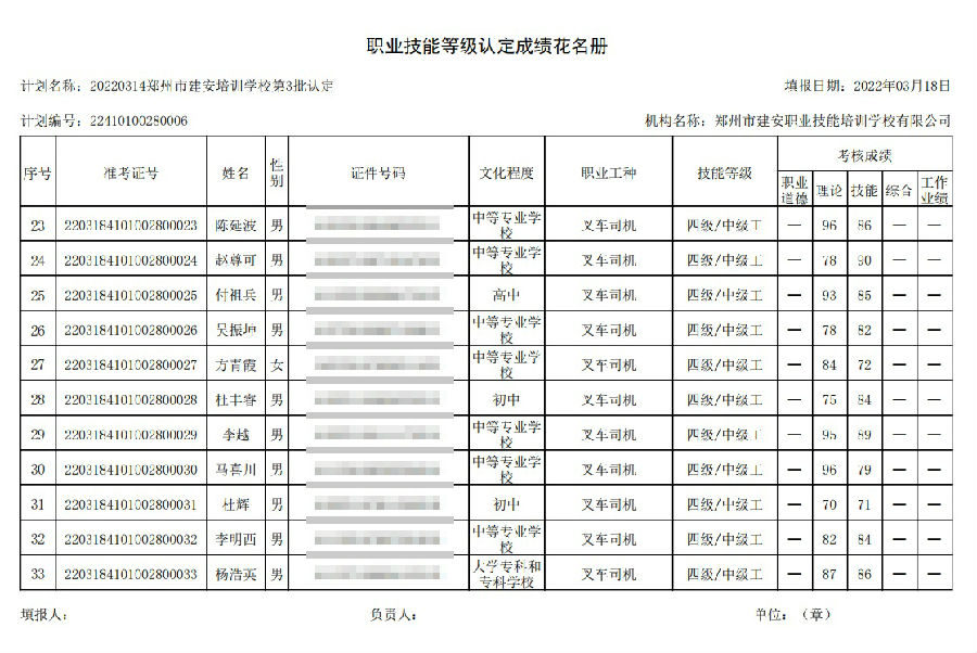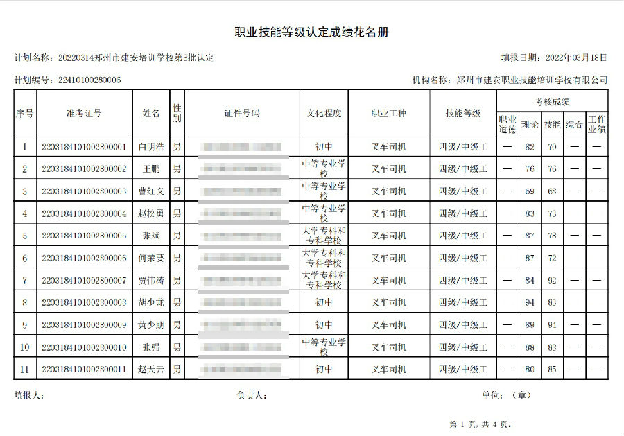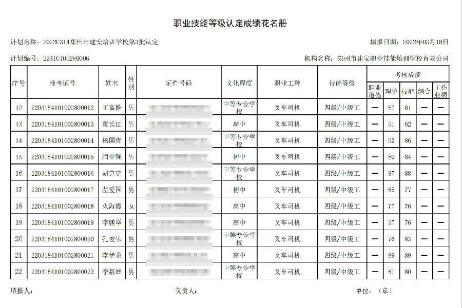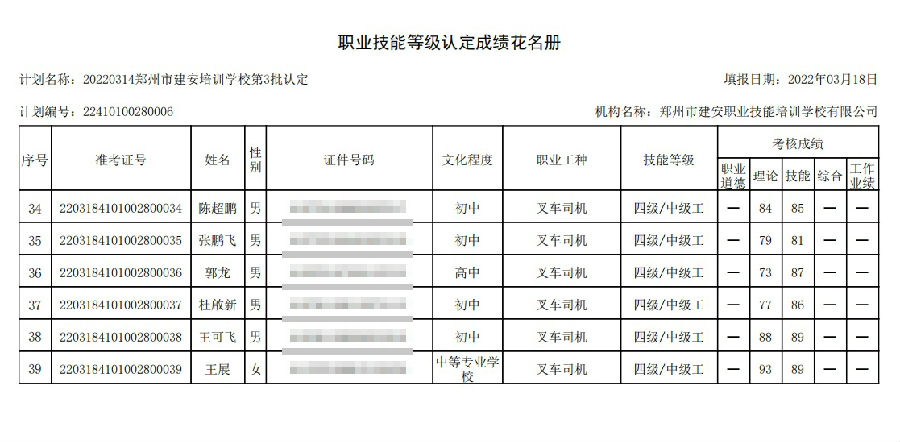 2022年03月18日在郑州建安技能培训学校进行的【叉车司机 四级/中级工】职业技能等级认定考试,阅卷工作已结束,现将各位考生成绩予以公示,公示期为7天,公示期限为:2022年03月19日至2022年03月6日。
