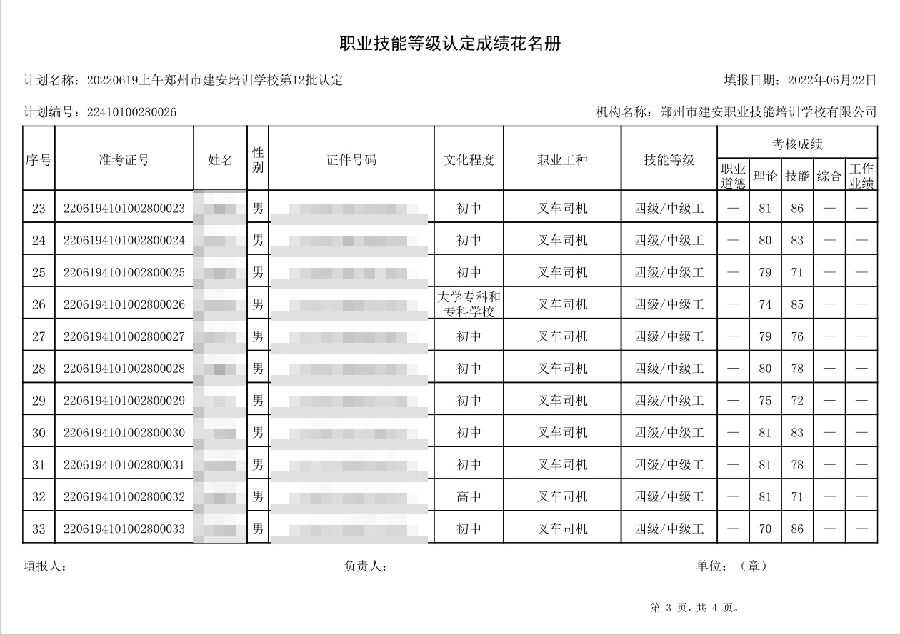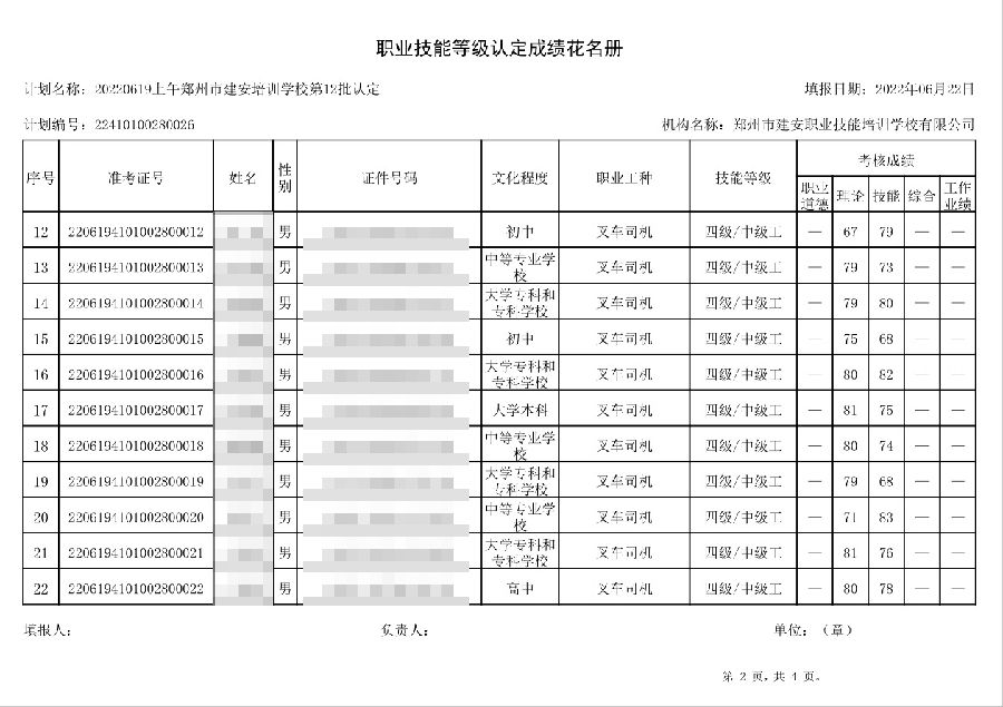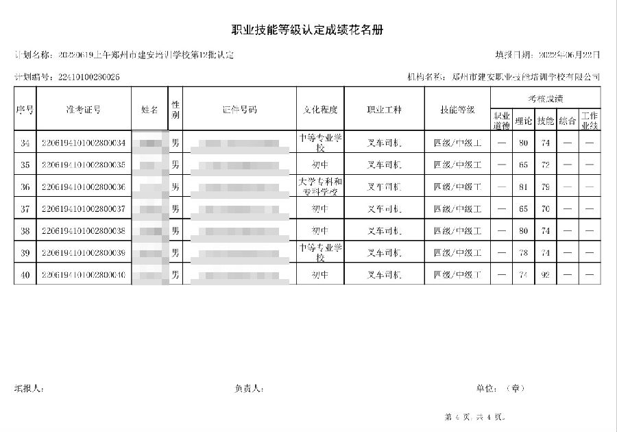 2022年6月19日上午,在郑州市建安技能培训学校进行的【叉车司机 四级/中级工】职业技能等级认定考试,阅卷工作已结束,现将各位考生成绩予以公示,公示期为7天,公示期限为:2022年6月24日至2022年7月1日。