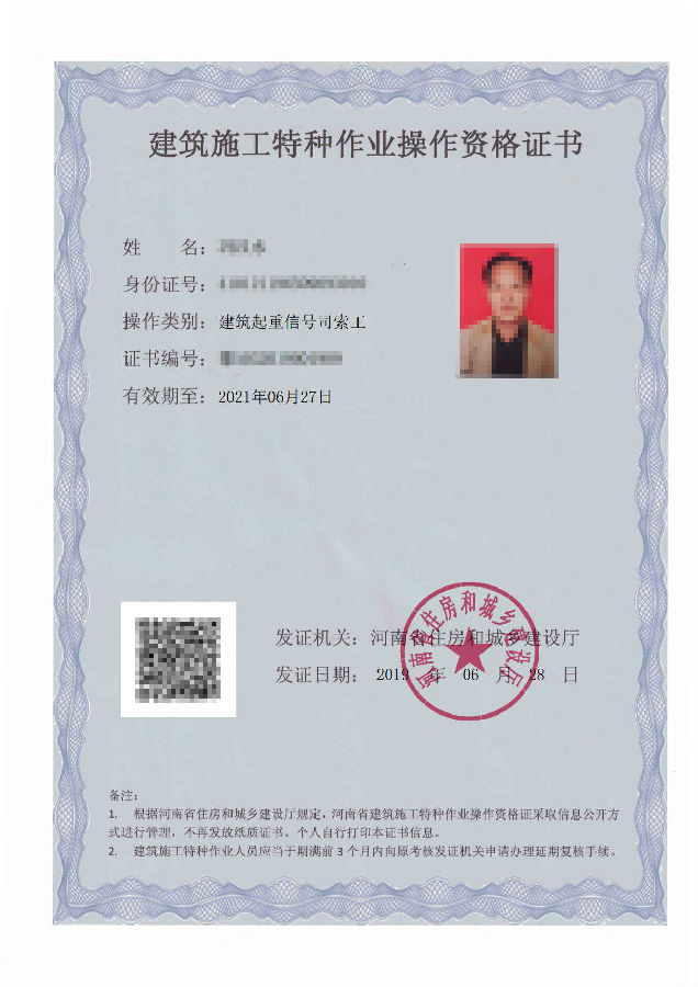 2、市场监督管理局特种设备证书:特种设备安全管理A(电梯、起重机械、场(厂)内专用机动车辆)、叉车司机N1、观光车和观光列车司机N2、起重机械指挥Q1、起重机司机Q2(桥式、门式起重机、塔式起重机、门座式起重机、缆索式起重机、流动式起重机、升降机司机)、大型游乐设施修理Y1、大型游乐设施操作Y2